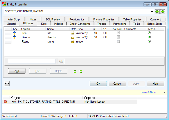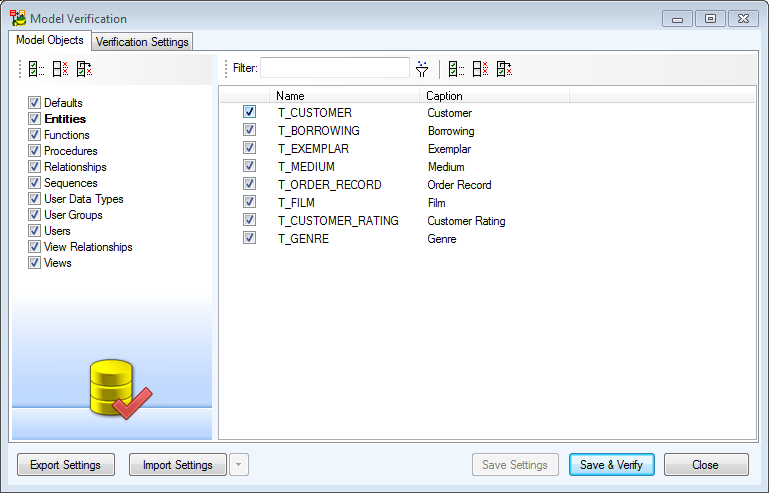 Toad Data Modeler allows you to verify your models. You can choose the items you want to verify, find out what errors and flaws your model contains and use quick fixes to resolve any issues.