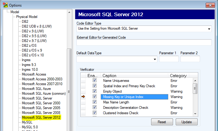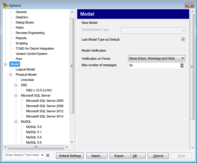 Model Verification can be configured for each specific database. Go to Settings Menu | Options | Model | Physical Model | *Target Database*.