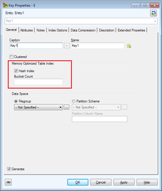 • New options available for keys of Memory Optimized tables in Key | General - Hash Index and Bucket Count (only available with checked Hash Index