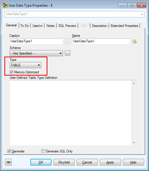 • New option to define User Data Type as Memory Optimized (User Data Type Properties | General), User Data Type has to be of TABLE type