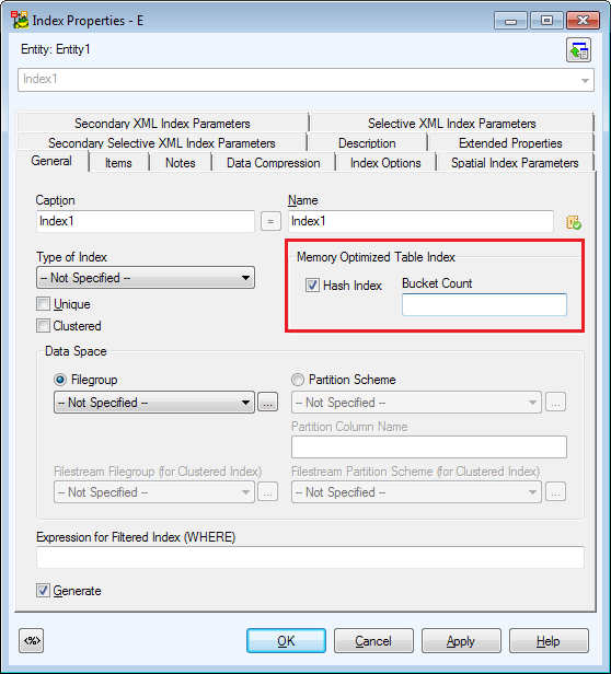 • New options available for indexes of Memory Optimized tables in Index | General - Hash Index and Bucket Count (only available with checked Hash Index