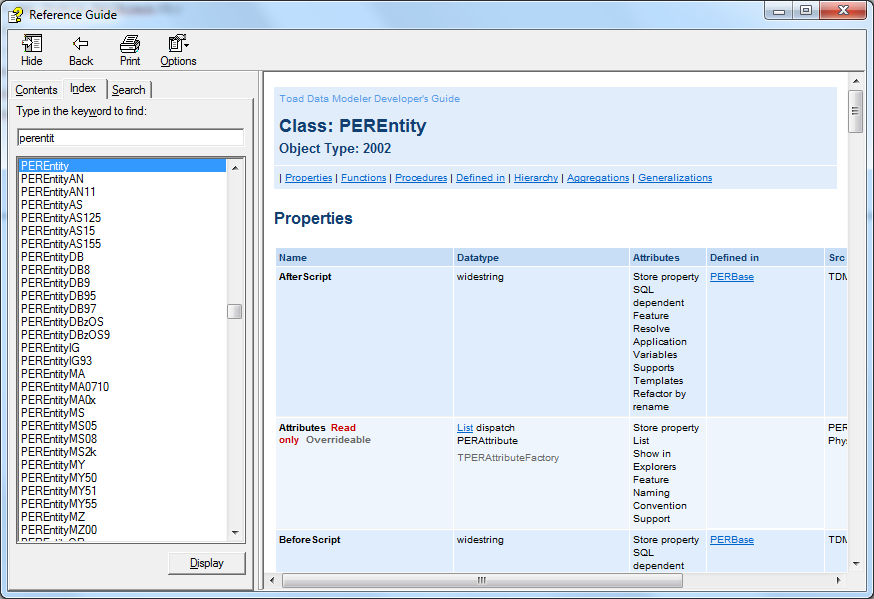 More information about the Entity object can be found in the Reference Guide (in Expert Mode main menu, Expert Mode has to be enabled first). See PEREntity class or PEREntityOR (for Oracle) class etc.