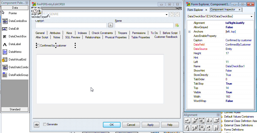 Select DataMemo from Component Palette and add new text field (datamemo) item to the Customer Feedback tab.