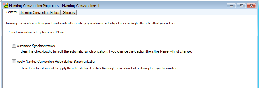 Description: When enabled, model objects will be automatically verified to see if they don't violate Naming Convention Rules. The verification will occur during Naming Convention Verification and Synchronization process and also when you open Properties dialog of any object.
