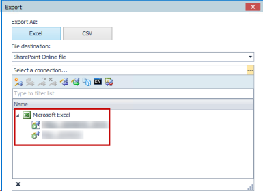 Note: When exporting data to an Excel or CSV file stored on SharePoint Online Server, the file path will be greyed out as a distinct difference between locally stored files.