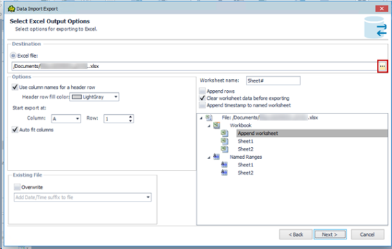 Note: A file must be specified to establish the connection, but you can change it or create a new one in the next step, the Select Output Options step.