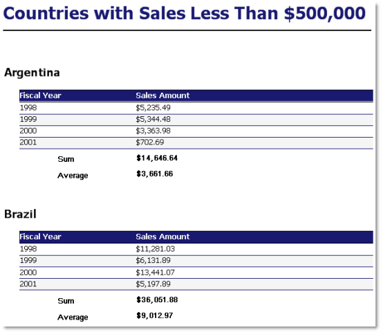 8. Enter Countries with Sales Less Than $500,000 in the Report Title field, and then click Finish. The initial report layout displays in the Report window with the information grouped under bands. See Add Report Bands for more information for more information about bands.