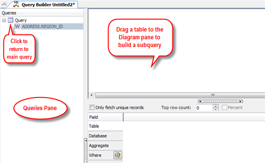 • The child (subquery) Query Builder window includes a Diagram pane, a Criteria pane, and a Queries pane for navigating back and forth between subqueries and the main query.