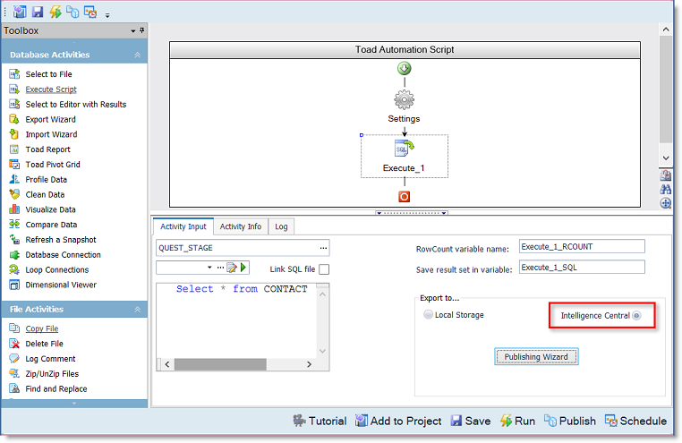 In Automation, the Execute Script activity is used to publish data to Intelligence Central. This activity executes a SQL query and then exports the result set to the selected Intelligence Central connection.