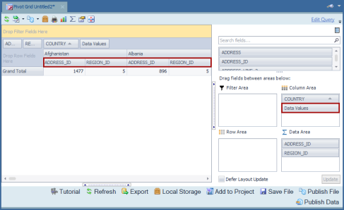 When the Data Values item is moved from the Column to the Row area, the format of the Pivot Grid remains the same. Only the headers of the Data area columns are moved under the Row columns in the Pivot Grid: