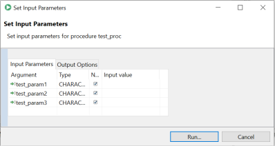 • If your procedure or function accepts parameters, you will be able to enter them before operation in the Set Input Parameters window