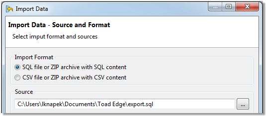 Importing data is the fastest way to populate your tables. Toad Edge offers data import from SQL (INSERT or MERGE statements) or CSV files. You can even import data from ZIP archives that contain these files.
