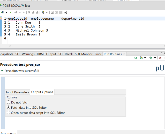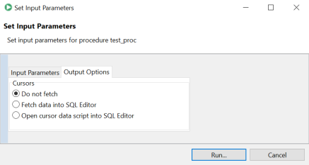 • Fetch data into SQL Editor - Selecting this option retrieves the data of a ref cursor into the SQL Editor.