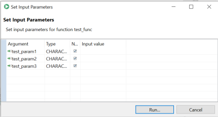 • If your function accepts parameters, you will be able to enter them before operation in the Set Input Parameters window