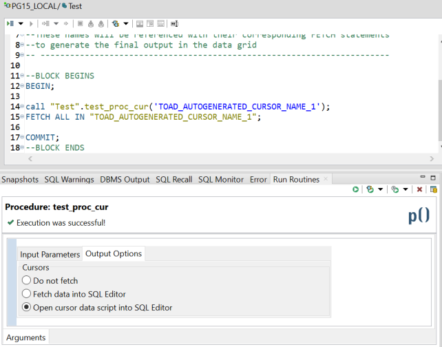 NOTE: This feature works with INOUT refcursors only. The data will not display if the cursor has been closed before Toad Edge tries to pull data from it.