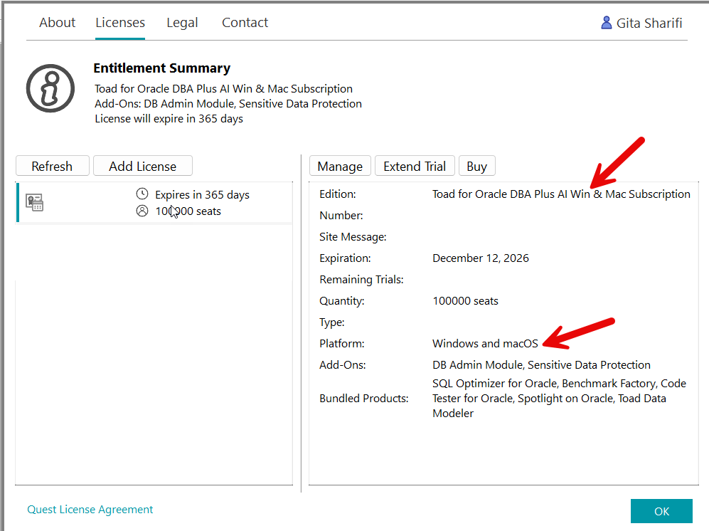 As of Toad for Oracle version 2025R3 release, new Windows and Mac licenses have been introduced to use Toad on Windows and Mac environments with a single Win&Mac combo license.